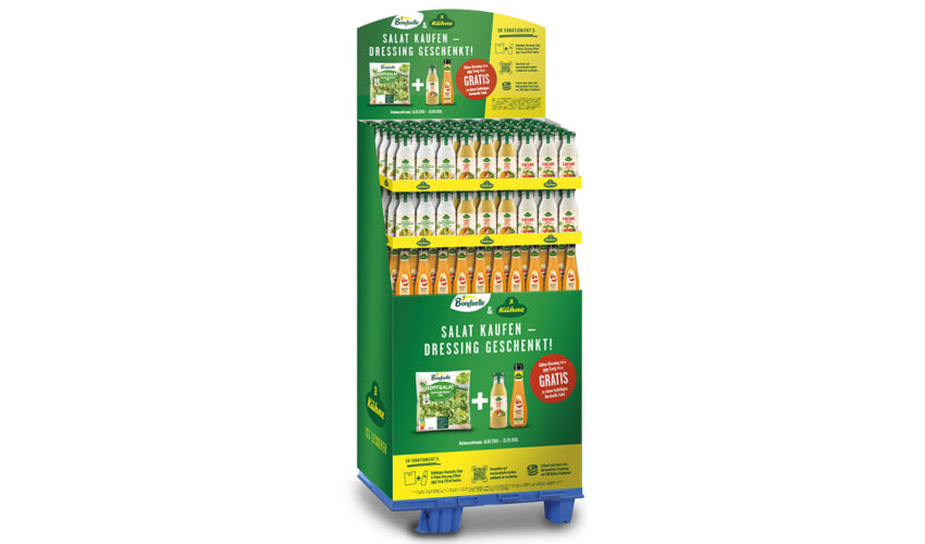 Um die einen kategorieübergreifenden Kaufanlass bietende Aktion aufmerksamkeitsstark zu präsentieren, wird sie von umfangreichen POS-Maßnahmen flankiert. Eine zentrale Rolle spielt dabei die On-Pack-Kommunikation, mit der die Promotion direkt auf den Bonduelle-Fresh-Cut-Produkten sichtbar wird. Regalschienenstecker, Plakate und Hartfolien sorgen im Kühlregal für Orientierung, während Wobbler am Regal sowie Aktionsdisplays in der Nähe der Fresh-Cut-Regale die Zweitplatzierung der Kühne-Produkte die Kategorie-Verknüpfung am POS verstärken. Zudem gibt es Social-Media-Maßnahmen, die die POS-Aktivierung digital verlängern und zusätzliche Abverkaufsimplulse unterstützen.