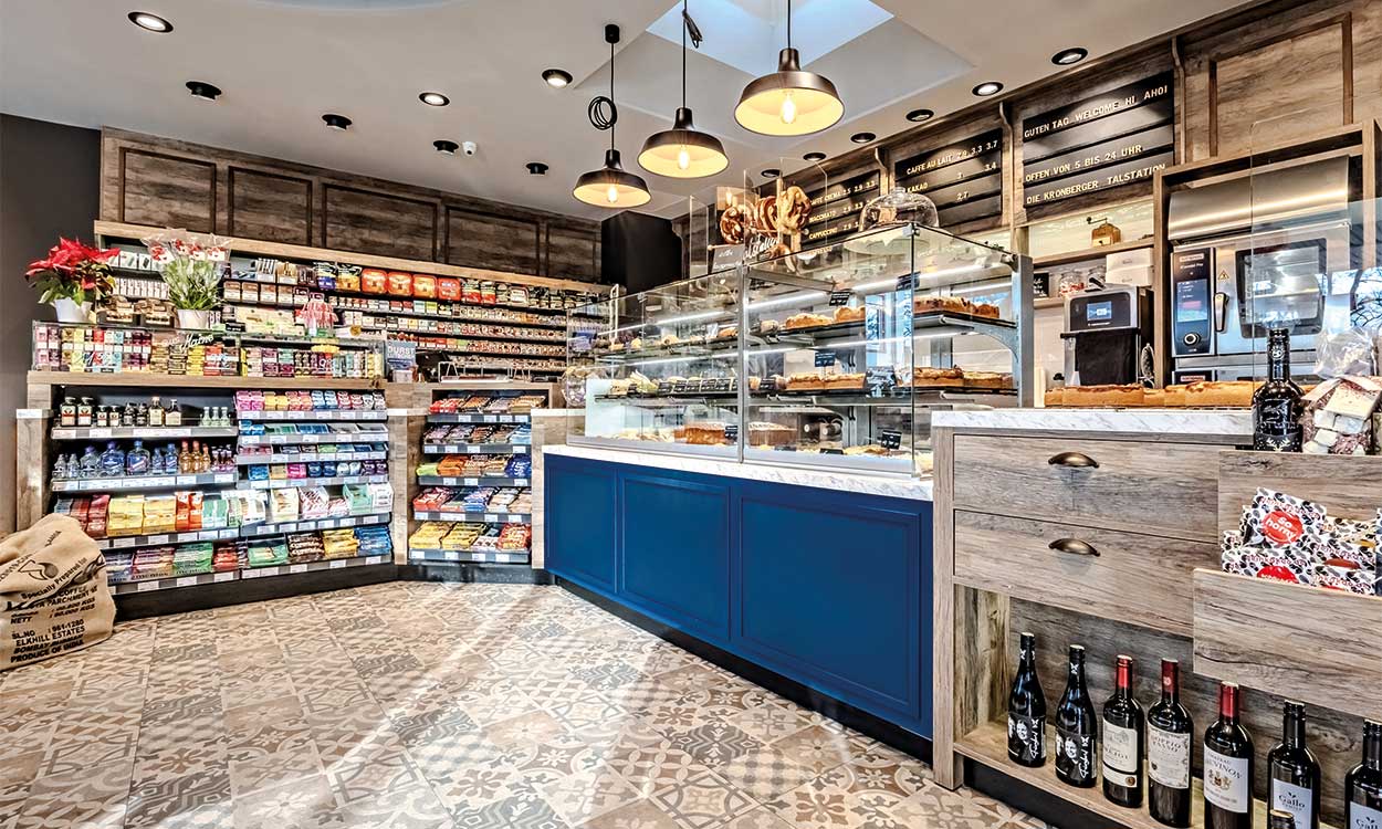 Volker Walz: Baldachine über der Kassenzone und auch multifunktionale Regale zur Zonierung von Bistro und Shop sind bewährte und wiederkehrende Gestaltungselemente. Jüngst haben wir einen SB-Bereich für Backwaren, Kaffee und Snacks entwickelt. Display, ESLs, Self-order-Terminals und Self-check-out-Kassen planen wir, wenn möglich, mit ein.