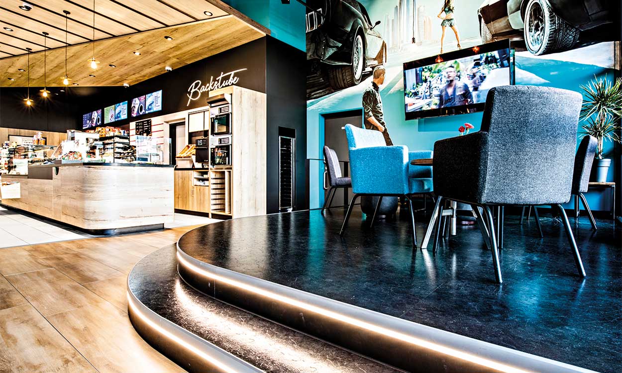 In Szene gesetzt: Das Filmhighlight „The Fast and the Furious“ ist das Thema in dem Bistro der Esso-Station in Neubrücke. Foto: s-iQ Objekt