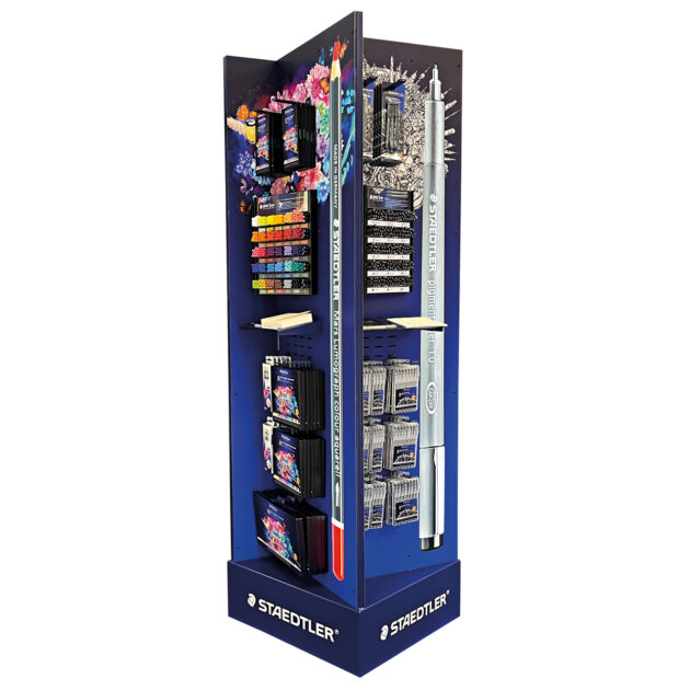 Der stabile Grundkorpus aus Metall verleiht der Konstruktion langlebige Solidität, während die Verkleidung aus Alu-Dibond dem Auftritt eine moderne, glatte Anmutung gibt. Auffällige, aus opalem Acryl gefertigte Riesenstifte dienen als leuchtendes Gestaltungselement und transportieren den kreativen Markenkern. Ergänzt wird die Lichtwirkung durch die blaue LED-Ausleuchtung am Boden, die das Display elegant vom Umfeld abhebt und für visuelle Tiefe sorgt. Jedes der vier Seitenmodule aus Polystyrol ist funktional gestaltet und bietet strukturierte Präsentationsflächen für unterschiedliche Sortimente. Insgesamt verbindet die Konstruktion technische Präzision mit ästhetischer Strahlkraft und macht damit den Premiumanspruch von STAEDTLER sichtbar.