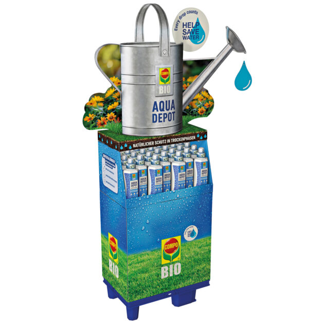 Eine überdimensionale Gießkanne als Blickfang und Symbol für Ressourcenschonung macht das Display zum visuellen Highlight der COMPO Aqua Depot Einführung.