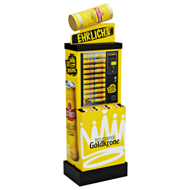 Dieses aufmerksamkeitsstarke Display kombiniert ikonisches Design mit praktischer Funktion. Die Dosenentnahme mit automatischem Nachschub-Effekt erzeugt einen echten Aha-Moment am POS. Gefertigt aus offsetkaschierter Wellpappe präsentiert sich das Display im auffälligen Markengelb mit überdimensionaler Dose als Topper und in der Optik eines Getränkeautomaten. Die nachhaltige Pappkonstruktion ist komplett nachfüllbar und für eine Standzeit von wenigstens vier bis sechs Wochen ausgelegt. Ideal im Spirituosenbereich platziert, zieht die authentische Präsentation der Wilthener Goldkrone & Cola alle Blicke auf sich. Das Konzept überzeugt durch Stabilität, Markenstärke und eine überraschend einfache Handhabung, die Funktionalität und Erlebniswirkung perfekt verbindet.