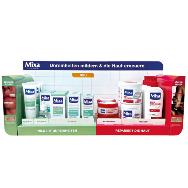 Der Mixa Innoboden verbindet wirkungsvoll Gesichtspflege gegen Unreinheiten mit reparierender Körperpflege – alles in einem kompakten, aufmerksamkeitsstarken Bodendisplay. Besonders markant: Die beiden seitlichen Designelemente greifen die charakteristische Form des Mixa-Logos auf und verleihen dem Display eine hohe Wiedererkennbarkeit am POS. Die strukturierte Sortimentsdarstellung nach Kategorien und Pflegephasen führt Shopper intuitiv von Reinigen über Boost und Pflege bis hin zur Reparatur. Hergestellt aus offsetkaschierter Wellpappe, wird das Display aufgerichtet angeliefert und am Gondelkopf für vier Wochen platziert. Die klare Headline „Unreinheiten mildern & die Hautbarriere stärken“ bringt die Markenbotschaft auf den Punkt.