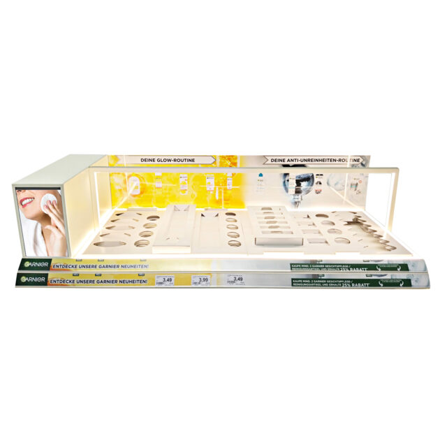Entwickelt für Garnier, vereint die Präsentation Funktionalität, Markenästhetik und Shopper-Guidance in einer eleganten Einheit. Die klar gegliederte Aufteilung in verschiedene Routinen, wie „Glow“ und „Anti-Unreinheiten“, erleichtert die Navigation und hebt das Sortiment übersichtlich hervor. Durch hinterleuchtete Bereiche und gezielte LED-Akzente entsteht ein moderner, laborinspirierter Look, der Kompetenz und Reinheit vermittelt. Zudem ist seitlich ein digitaler Screen angebracht. Der Inhalt des Touchscreens kann über ein cloudbasiertes CMS verwaltet werden. Das robuste, pulverbeschichtete Metallgestell gewährleistet Stabilität im täglichen Einsatz. Integrierte Preisschienen und Austauschflächen ermöglichen eine schnelle Aktualisierung. So entsteht ein funktionales, hochwertiges Systemdisplay, das die Marke Garnier sichtbar modern positioniert.