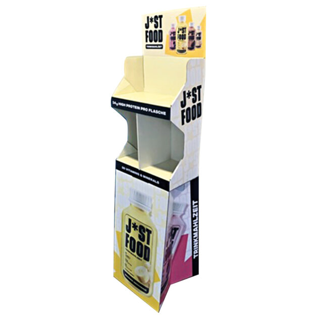 Als kompakter „stummer Verkäufer“ bringt das JUST FOOD Display mit großer Nachhaltigkeit Markenpräsenz direkt zwischen die Regalgänge des Handels.
