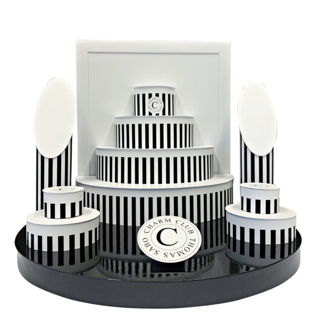 Das Thomas Sabo Jubiläumstorten-Display, entstanden in Zusammenarbeit mit Ritzi, feiert 20 Jahre Charm Club mit einer eleganten, strahlenden Inszenierung am POS. Die Form einer stilisierten Torte vereint Symbolkraft und Emotion – ein funkelnder Eyecatcher, der Freude, Exklusivität und festliche Stimmung vermittelt. Hergestellt aus hochwertiger Wellpappe und Kunststoff, verbindet das Display Stabilität mit edler Optik. Die beschwerten Säulen ermöglichen eine stilvolle Präsentation von Halsketten und setzen sie perfekt in Szene. Das austauschbare Poster auf dem Backbord erlaubt eine flexible Anpassung an Kampagnen und sorgt für eine dauerhaft aktuelle Markenkommunikation. Dank des weltweiten Versands im kompakten Paketformat erreicht das Display effizient alle Standorte und trägt die Jubiläumsbotschaft rund um den Globus.